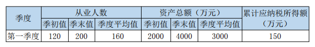 A企业为查账征收企业,从事国家非限制和禁止行业,2022年第一季度从业人数、资产总额、累计应纳税所得额如下图:
