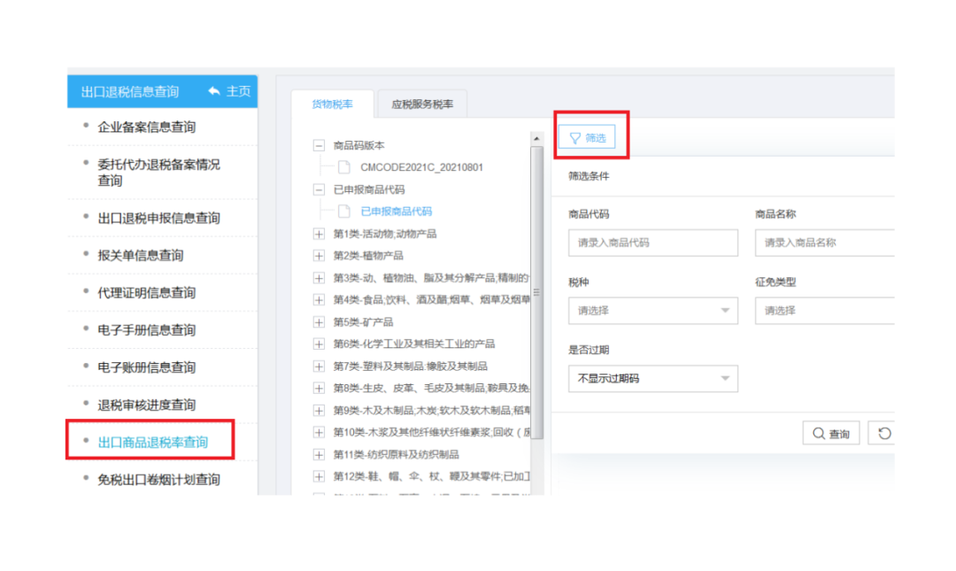 点击“出口商品退税率查询”,在筛选处输入商品代码,即可查询商品的出口退税率啦!